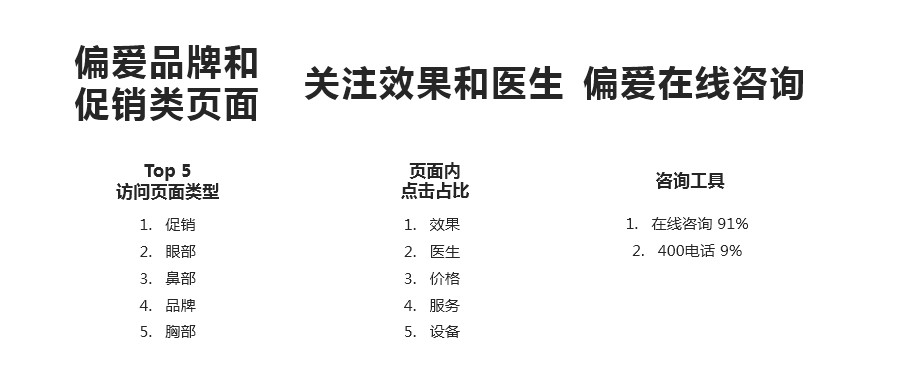 從這張圖我們可以看到,用戶偏好并經常訪問的頁面類型為促銷類頁面,其次是眼部醫美項目的頁面,而頁面點擊占比方面,首先關注的是醫美效果,其次是醫生的權威性和轉型性,在咨詢方面,用戶其實更傾向于在線咨詢的方式,你們get到了嗎?